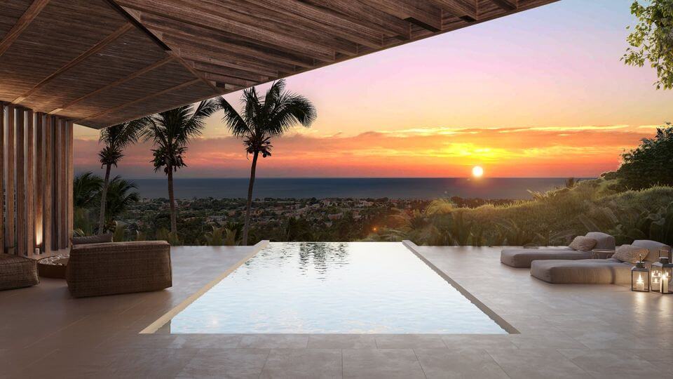 Accommodatie van 65m², met aparte slaapkamer met tweepersoonsbed, ruime woonkamer met geïntegreerde open keuken, badkamer en met grote tuin en uitzicht op het zwembad.